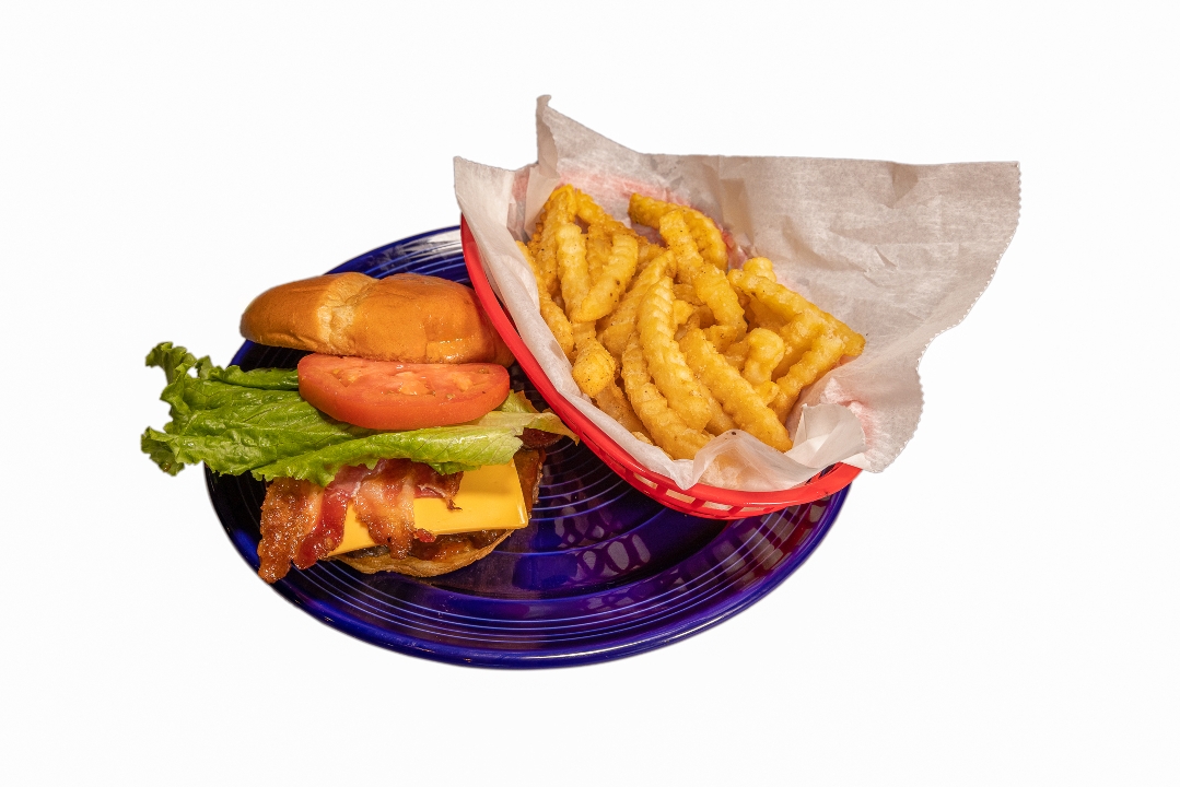 our Blue Plate cheeseburger with Monterey Jack cheese, crisp bacon, fried onion ring, and our homemade smoky BBQ sauce